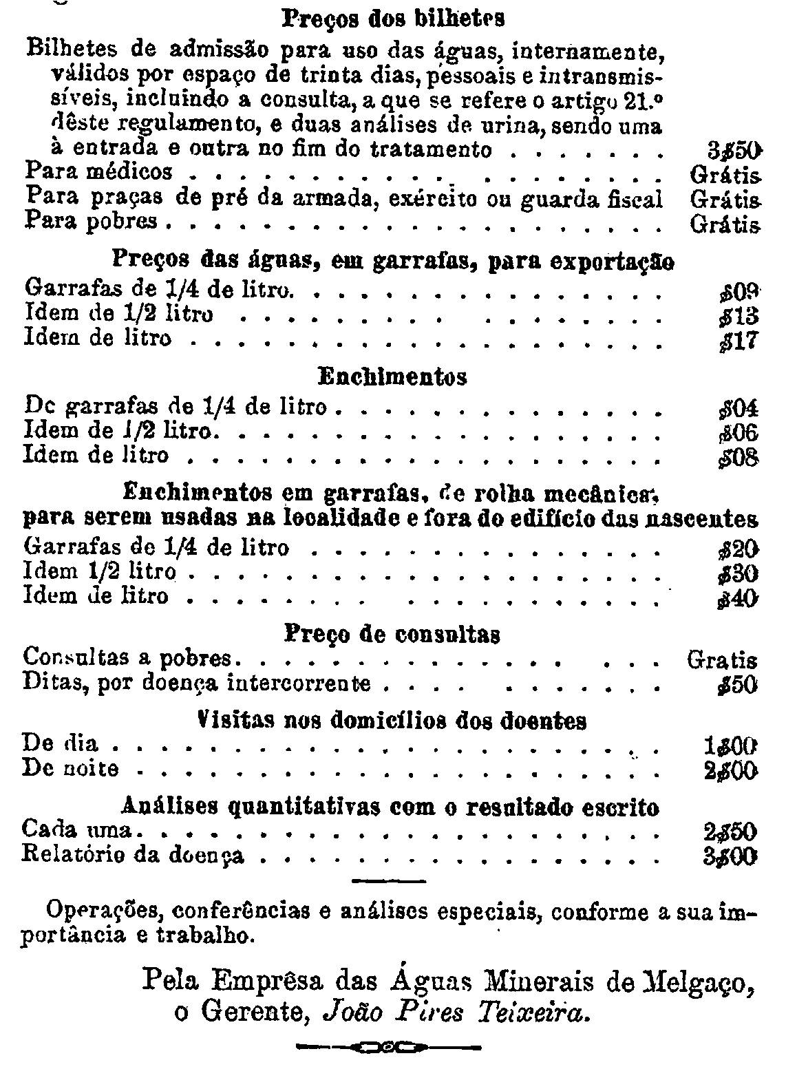 O mesmo jornal, em 8 de Junho, daquele ano, noticiava a abertura do Balneário, sob a direcção do Dr. Athias Ark e informava serem os preços praticados por aquele estabelecimento os seguintes: Inscrição médica 50$00, idem uso das águas 50$00, duches seclalisos 5$00, banho de imersão água mineral 6$00, irrigações vaginais no banho 7$00, banho bolha de ar em água comum 7$00, massagem geral 20$00, idem parcial 15$00, banho de imersão em água comum 4$50, idem bolha de ar em água mineral 8$50, banho gaso-carbónico 12$00, actinoterapia 15$00, duche ar quente 10$00, lençol e toalha 2$00, balança $50.
